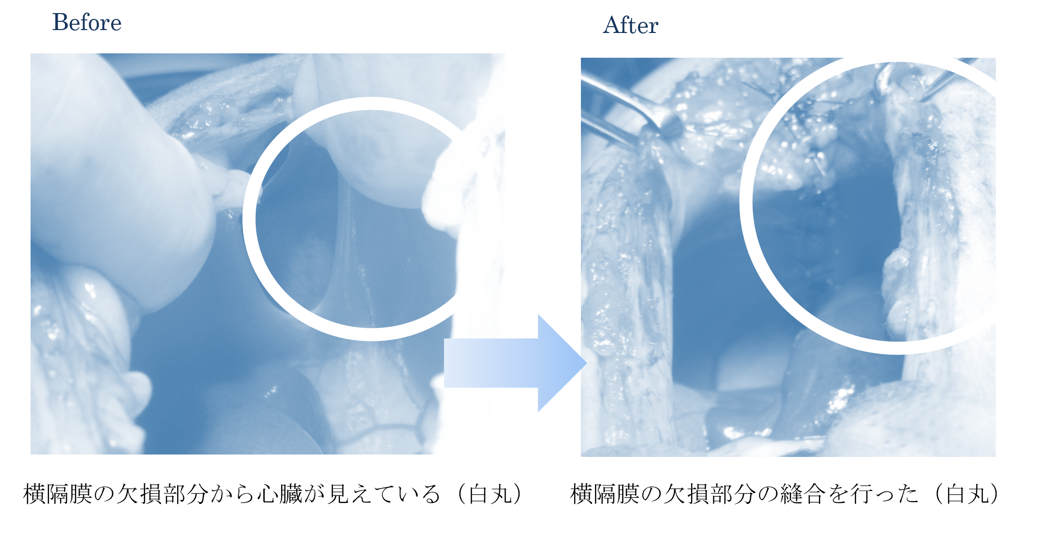 避妊手術の検査で横隔膜ヘルニアが疑われたためかかりつけの動物病院の紹介【横隔膜ヘルニア】【 ご来院の理由 】 避妊手術の検査で横隔膜ヘルニアが疑われたためかかりつけの動物病院の紹介。 【 処 置 】 各種検査より横隔膜ヘルニアと判断しました。 ご家族と相談した結果、避妊手術の際に横隔膜ヘルニアの整復も行いました。 術後数日で胸腔内ドレーンを抜去して無事手術は終了しました。