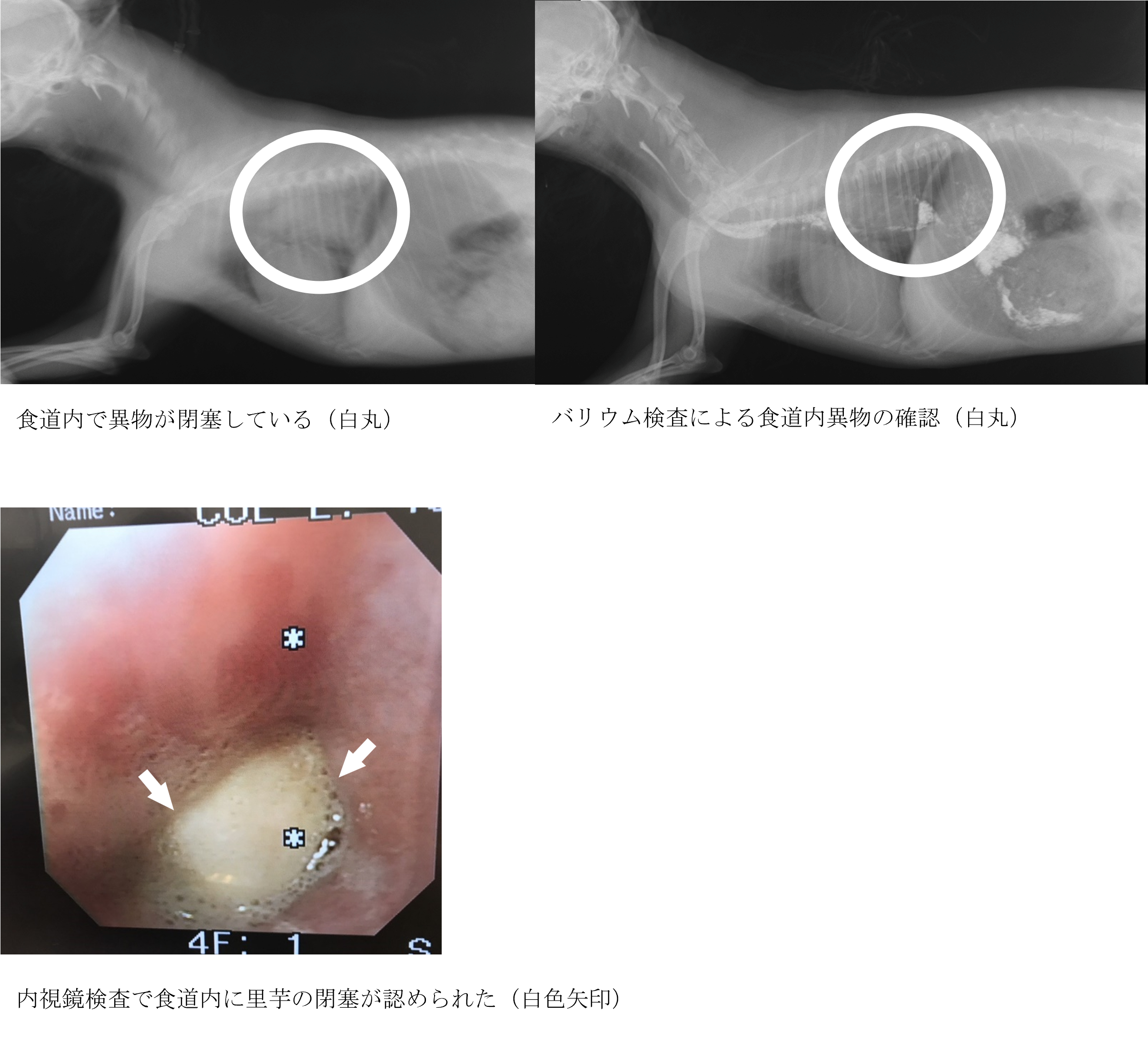 内視鏡では里芋が食道内に詰まっているのを確認しました。