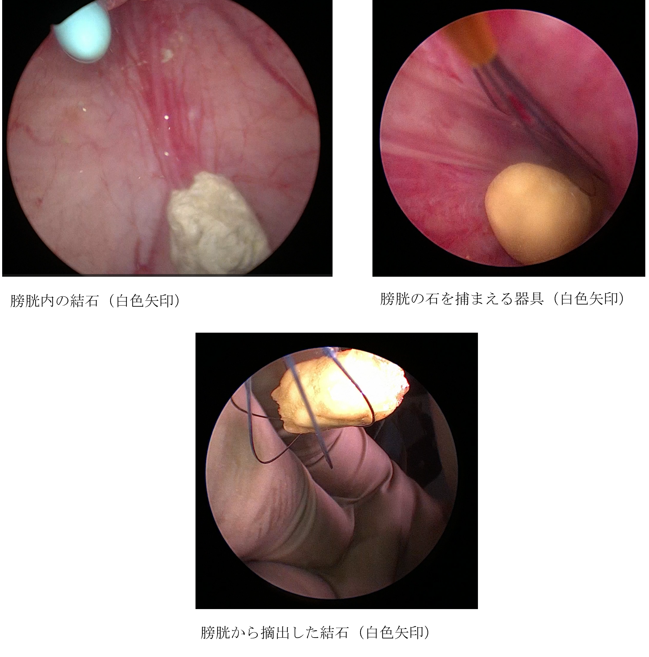 腹腔鏡補助下での膀胱結石の摘出手術では、内視鏡で膀胱内の結石を直接確認しながら摘出するため取り残しのリスクが低く、また粉のような結石も全て吸引して摘出するため根治性の高い手術方法です。