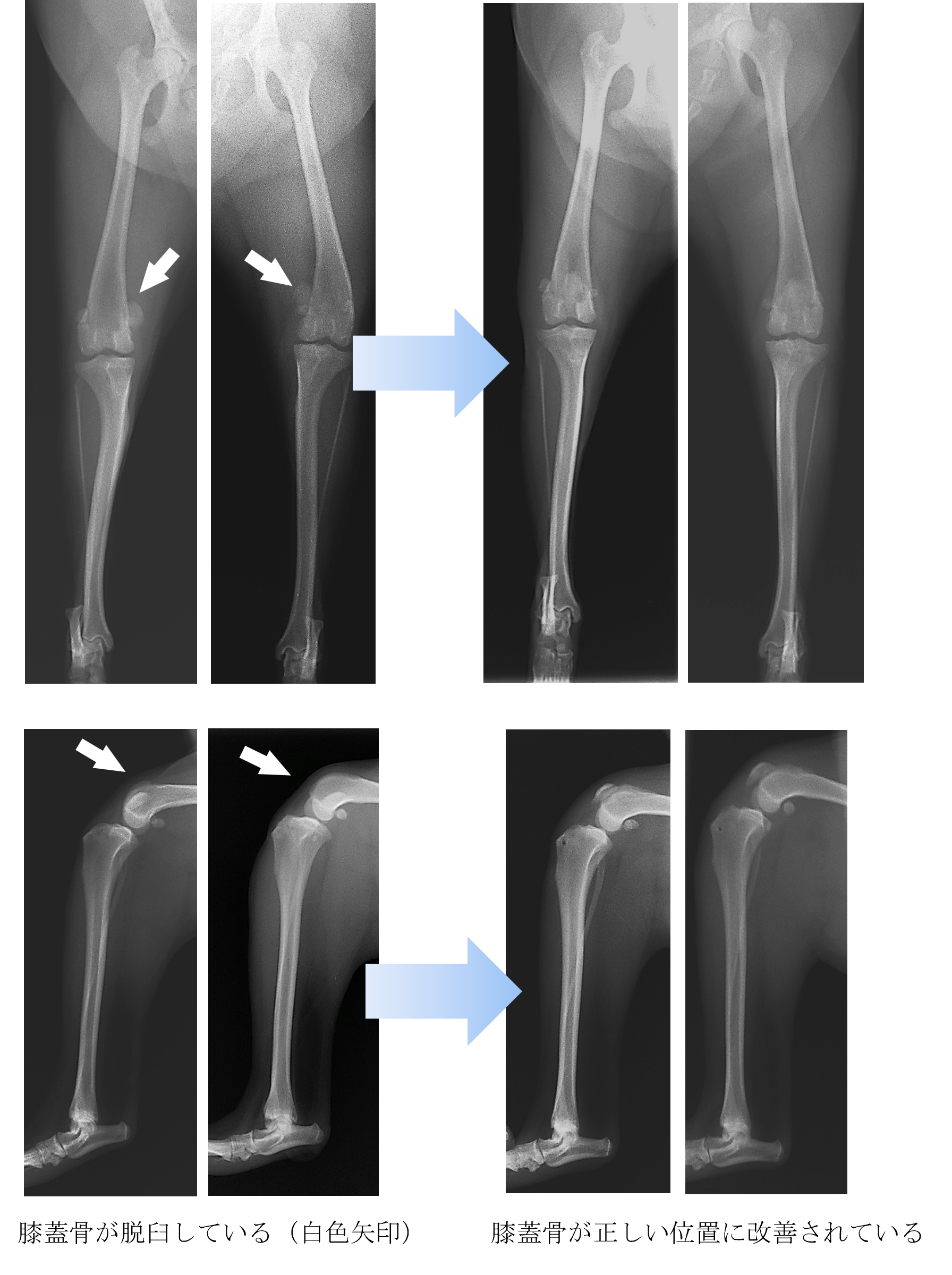 小さい時から歩き方がおかしかったが徐々にひどくなってきた【膝蓋骨脱臼(G4)】【 ご来院の理由 】 小さい時から歩き方がおかしかったが、徐々にひどくなってきた。 【 処 置 】 各種検査より、両側膝蓋骨(膝のお皿)脱臼(G4)と診断しました。 ご家族と相談して手術による膝蓋骨脱臼の整復を実施することになりました。 手術後は以前と同じように走ったり遊んだりすることができるようになりました。