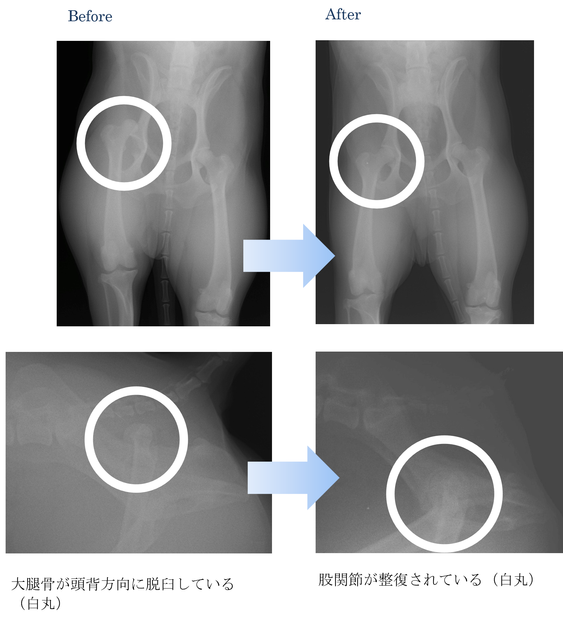 ボール投げ中に高くジャンプして着地したときに痛がり後ろ足を挙げている【股関節脱臼(頭背側)】【 ご来院の理由 】 ボール投げ中に高くジャンプして着地したときに痛がり後ろ足を挙げている。 【 処 置 】 各種検査より、股関節脱臼(頭背側)と診断しました。 ご家族と相談から、膝蓋骨脱臼を整復して外固定(包帯)を実施することになりました。 股関節が安定したころに外固定を外しました。 以前と同じように走ったり遊んだりすることができるようになりました。