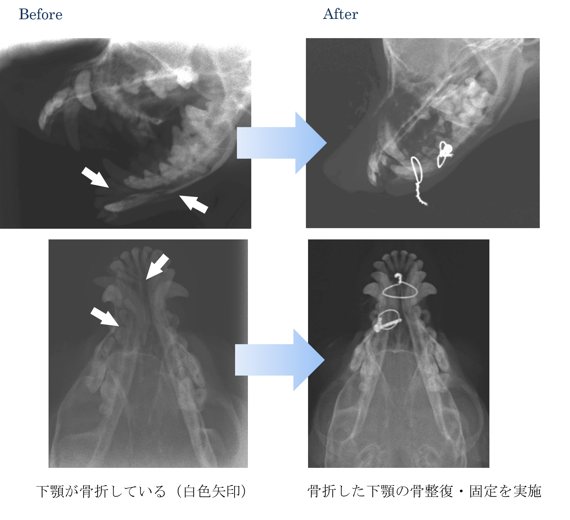 散歩中に外傷がおきて口から出血していておかしい【下顎の骨折】【 ご来院の理由 】 散歩中に外傷がおきて、口から出血していておかしい。 【 処 置 】 各種検査より、下顎の骨折と診断しました。 ご家族と相談して手術による下顎の骨折の整復・固定を実施することになりました。 手術後は以前と同じように食事することができるようになりました。