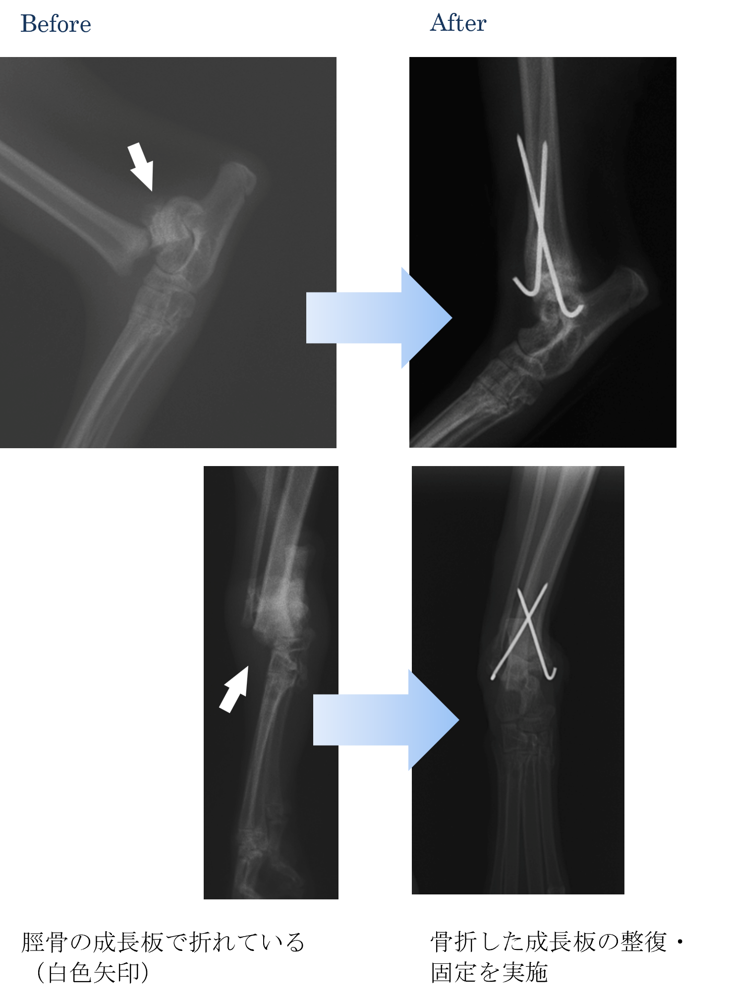 高いところから落ちてから痛がり後ろ足を挙げている【脛骨遠位成長板骨折】【 ご来院の理由 】 高いところから落ちてから痛がり後ろ足を挙げている。 【 処 置 】 各種検査より、脛骨(すねの骨)遠位成長板の骨折と診断しました。 ご家族と相談して手術で整復して固定を実施することになりました。 骨折部分が癒合したところでピン(金具)を抜去しました。 手術後は以前と同じように走ったり遊んだりすることができるようになりました。